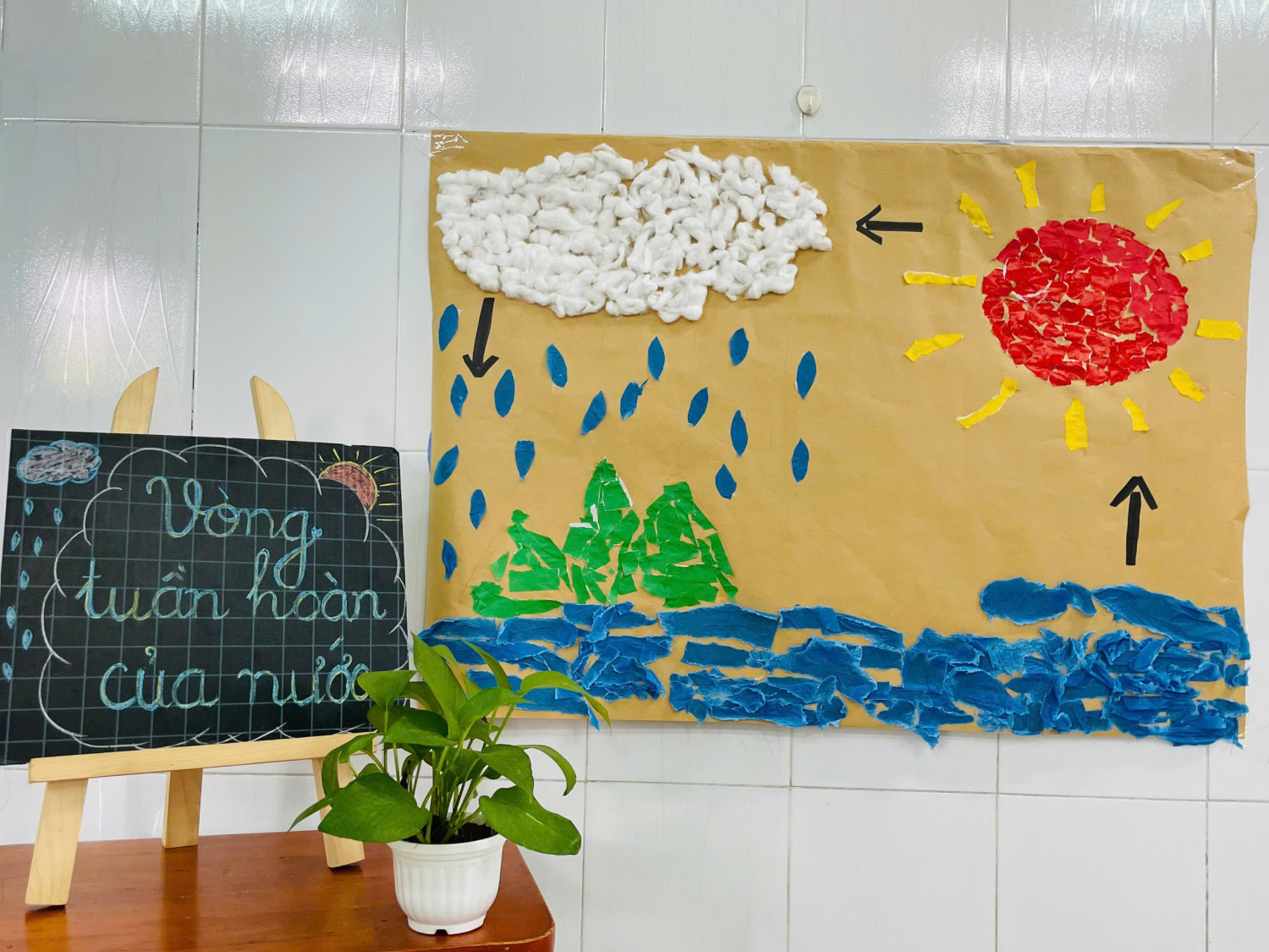 Sau hoạt động tìm hiểu, cô và các bé cùng nhau tạo nên một bức tranh về vòng tuần hoàn của nước với những hình ảnh sinh động như ông mặt trời ☀️, đám mây ☁️, hạt mưa 🌧️, sông suối 🌈🌊.