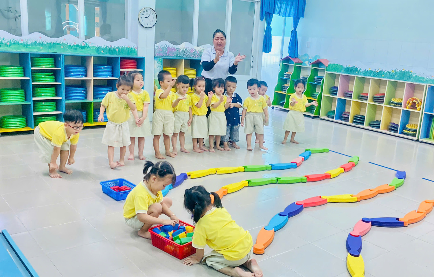 Hôm nay, các bé lớp Mầm 1 đã có một tiết học -Thể dục thật vui và đầy năng lượng với hoạt động “Bò dích dắc”