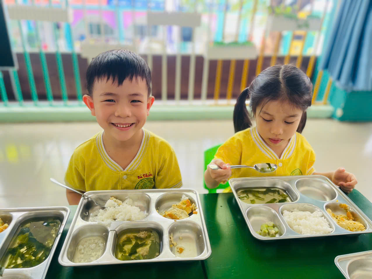 Đối với trẻ, bữa ăn trưa ở trường là khoảng thời gian vui vẻ và ấm áp. Mỗi trẻ có một khay ăn riêng, thức ăn được trình bày gọn gàng, màu sắc hấp dẫn. Trẻ được tự xúc ăn, được cô khen khi ăn ngoan, ăn giỏi. Nhờ đó, trẻ cảm thấy thích thú, ăn ngon miệng hơn và có thêm năng lượng để vui chơi, học tập vào buổi chiều.