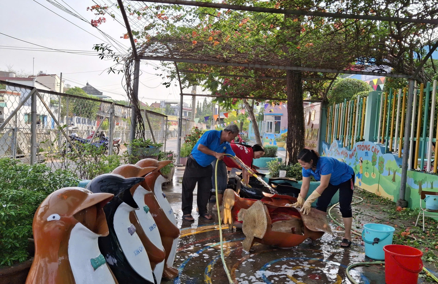 • Giáo viên thường xuyên vệ sinh lớp học, khử trùng bằng dung dịch Javel 🧽