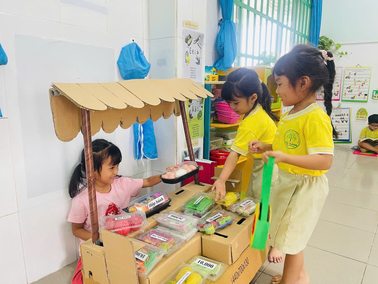 Ở góc gia đình, các bé đóng vai ba mẹ chăm sóc gia đình nhỏ của mình; còn tại góc người bán hàng, trẻ vào vai người bán – người mua, biết chào hỏi, trao đổi, mua bán đơn giản. Hoạt động giúp trẻ phát triển ngôn ngữ, kỹ năng giao tiếp và hiểu hơn về các vai trò trong cuộc sống hằng ngày.