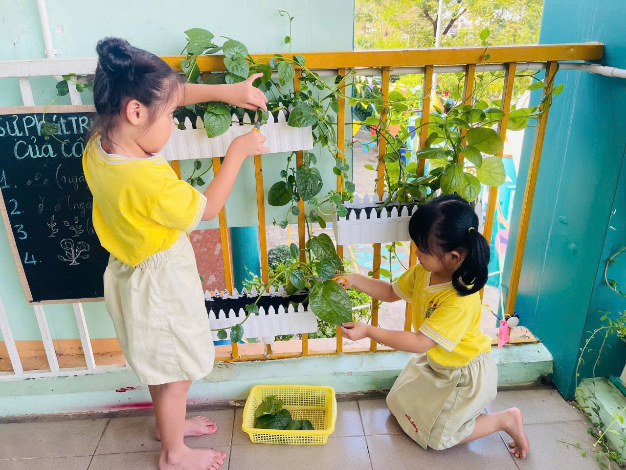 Ở góc thiên nhiên, các bé được chăm sóc, tưới nước và hái rau mồng tơi tạ góc thiên nhiên. Trẻ biết yêu quý cây xanh, hiểu giá trị của lao động và hứng thú hơn với thiên nhiên xung quanh.