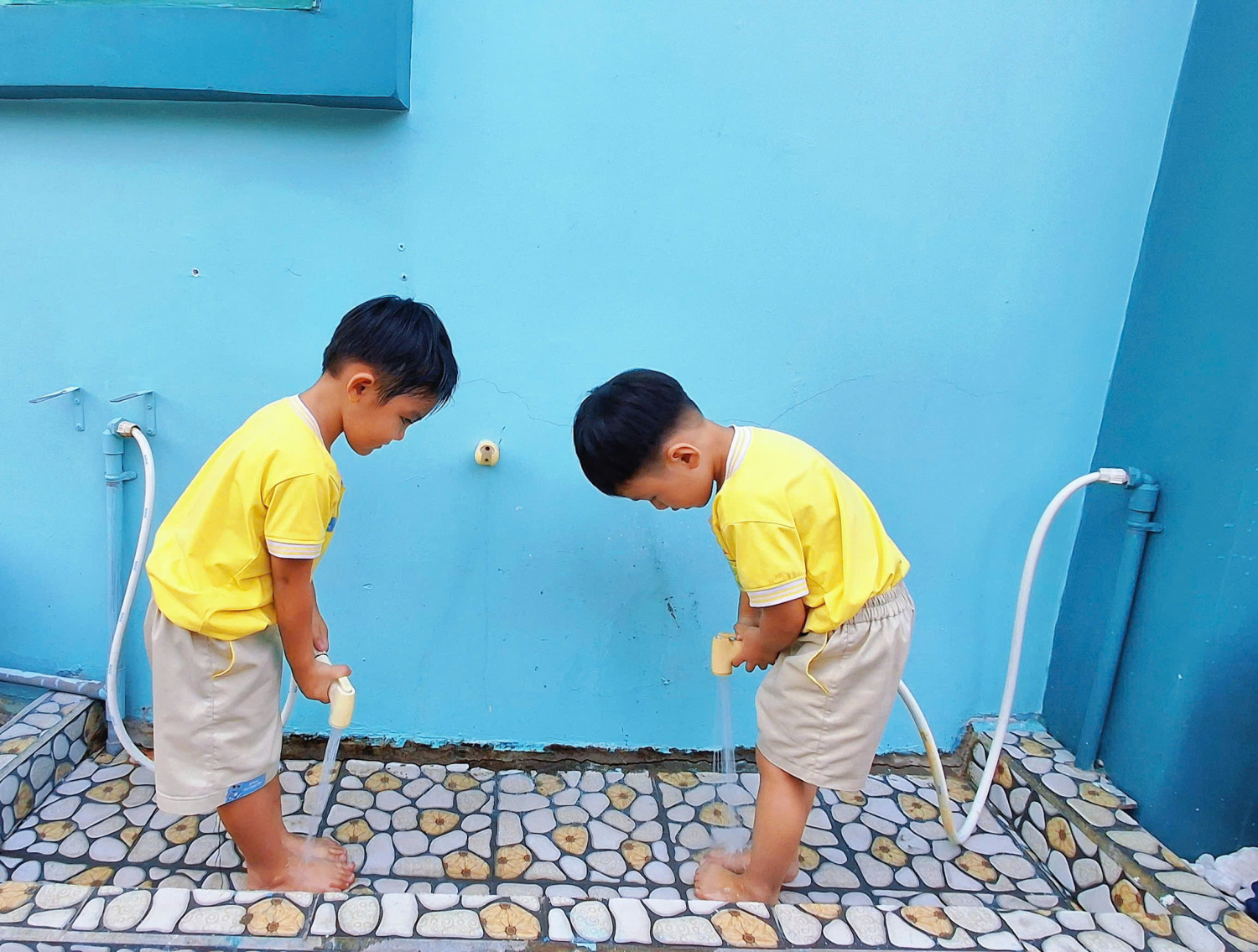 Sau các hoạt động vui chơi ngoài trời, các bạn nhỏ lớp Chồi 3 đều được cô hướng dẫn rửa tay, rửa chân bằng nước sạch để giữ cơ thể sạch sẽ và phòng tránh bệnh tật 💦👣
