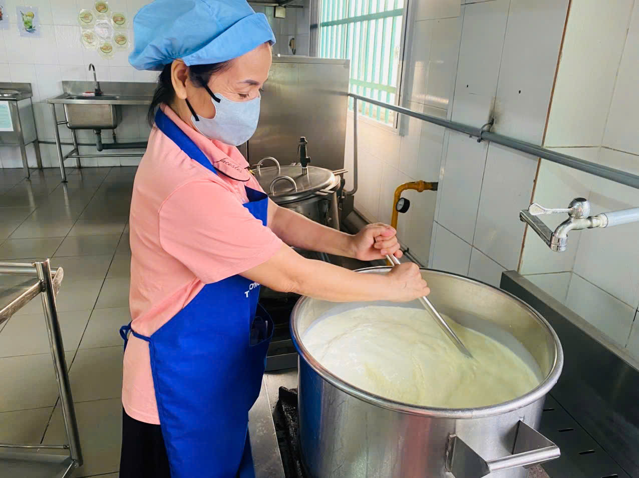 Từng công đoạn đều được các cô chăm chút: chọn nguyên liệu kỹ, khuấy nấu đúng nhiệt độ, kiểm tra độ ấm và đảm bảo vệ sinh tuyệt đối.